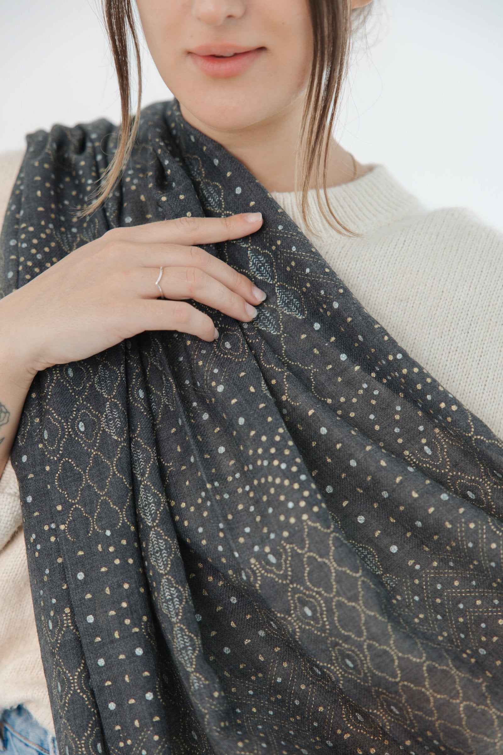 The Lunar Mosaic Scarf is a timeless statement piece crafted for those who appreciate art in subtlety. Made from a luxurious 92% Wool and 8% Silk blend, it combines softness, warmth, and delicate sheen. The intricate mosaic-inspired pattern in gold and silver glimmers gently against the dark charcoal base, evoking the elegance of moonlight over stone.