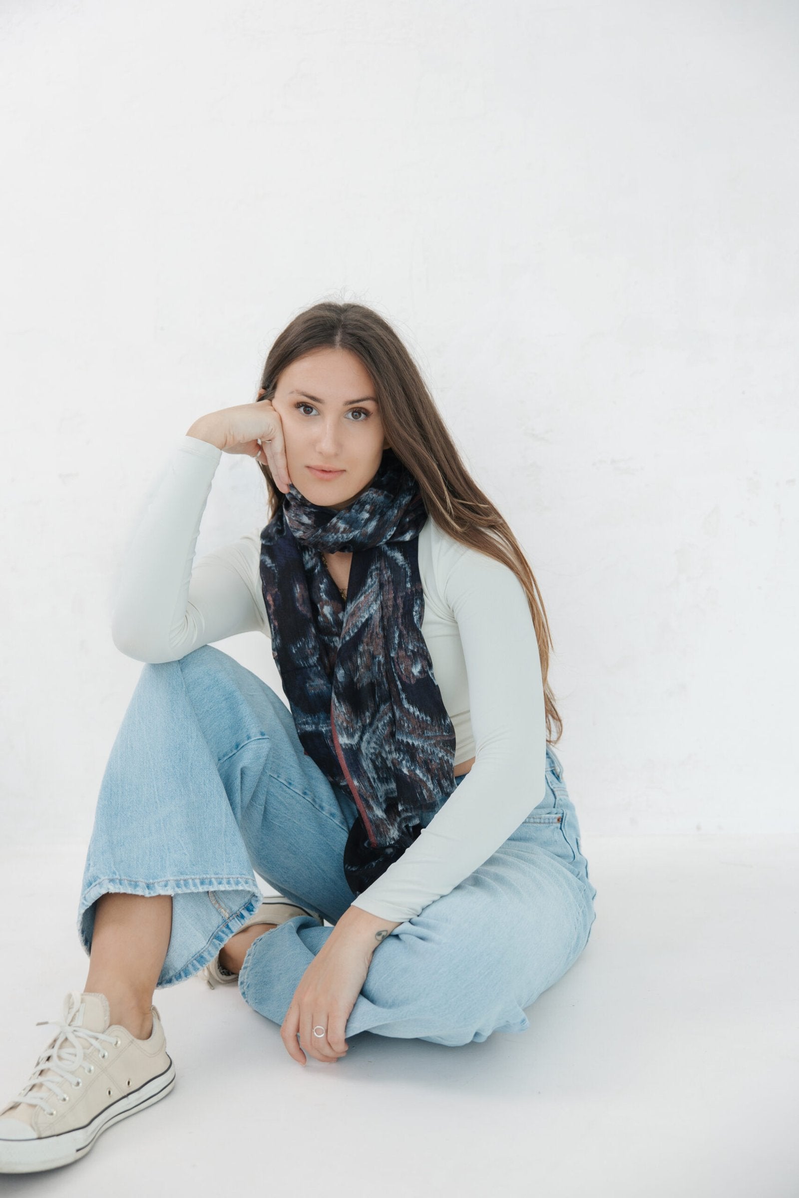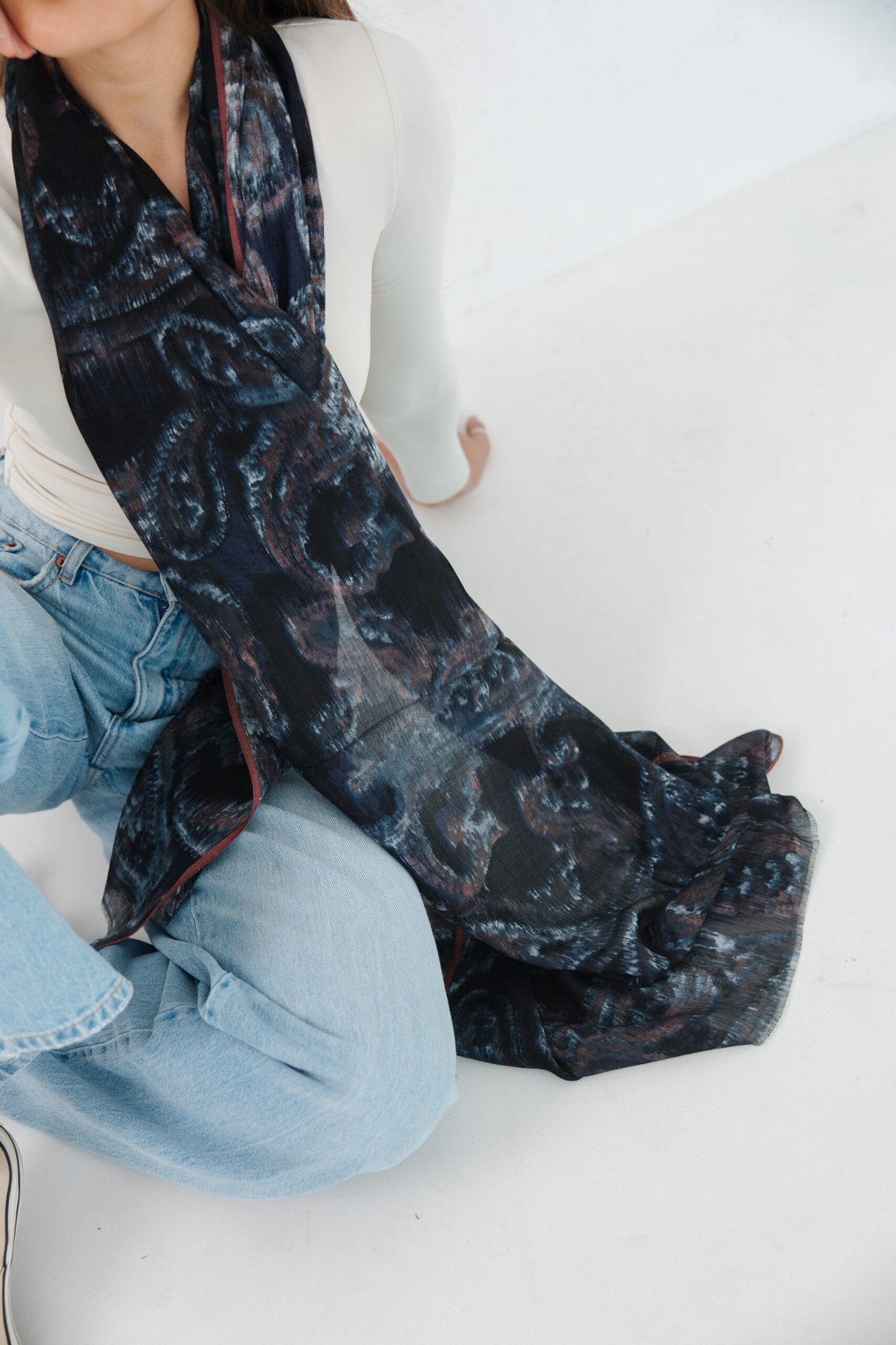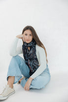 The Midnight Mirage Collection captures the mystery and elegance of twilight. Woven from a luxuriously soft modal-cotton blend, this scarf features a fluid drape and a rich, painterly design inspired by abstract art and natural textures.