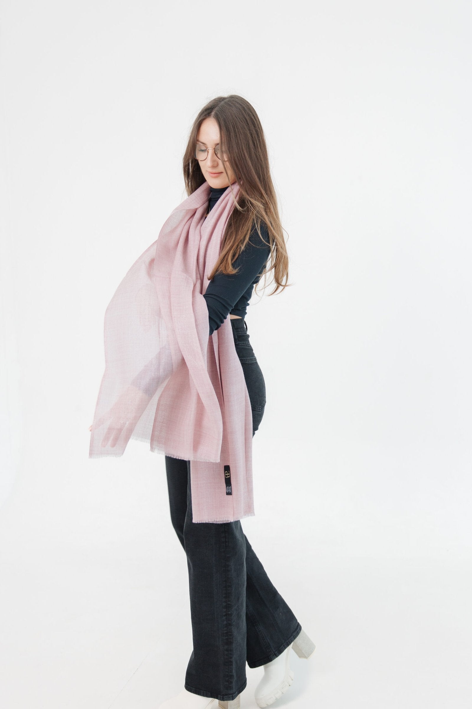 Wrap yourself in effortless sophistication with our Blush Glow Scarf, a luxury wool silk blend scarf designed for modern elegance. Made from 80% fine wool, 13% lurex, and 7% silk, it offers a soft blush pink hue with a delicate shimmer that catches the light beautifully. Lightweight yet warm, this versatile shimmer scarf adds a refined touch to any outfit — from casual daytime looks to elegant evening wear.